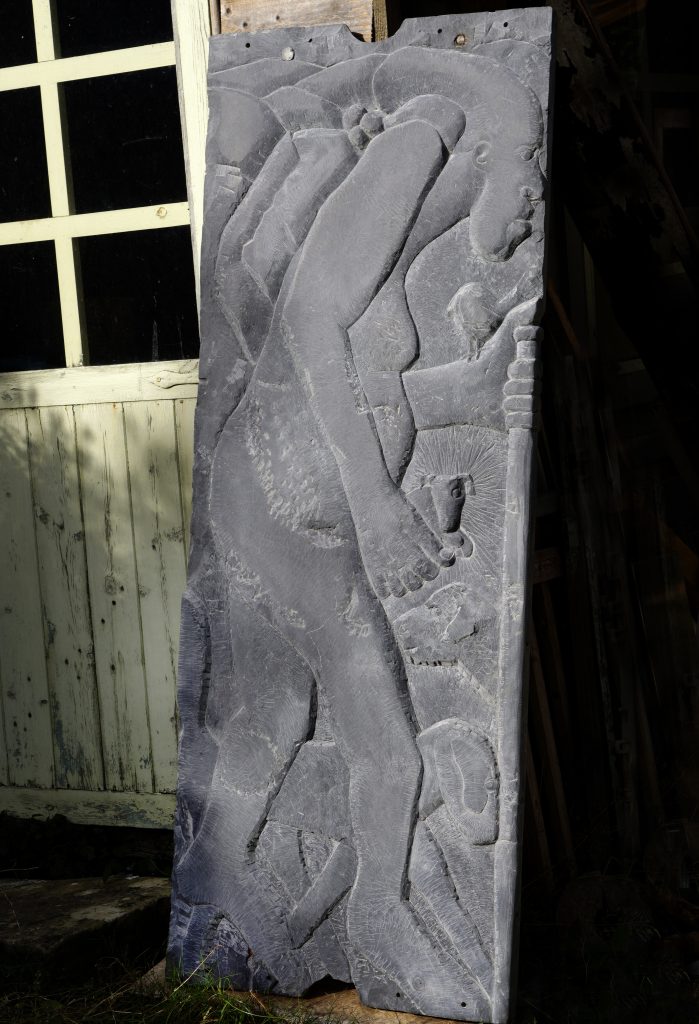 This recycled slate started to be be worked after its partner block Searching was completed in 2014. Through improvised mark making, it showed little progress until the time of the Every Step of the Way marble responding to my explorations above Amberley and Storrington. Moved to the vertical, the walking figure “appeared”. That is, the mind identified a previously-random selection of lines with an order which then informed further carving. Whilst Rehumanise (at Weald & Downland September 2025 onward) feels like an abstract, dreamlike landscape, Drover became increasingly representational. Its name plays on the outward story it ended with – a nod to the ancient users of these trackways moving animals who used dogs to help them, parallel with today’s recreational users and their pets – seeking both enjoyment and exercise.