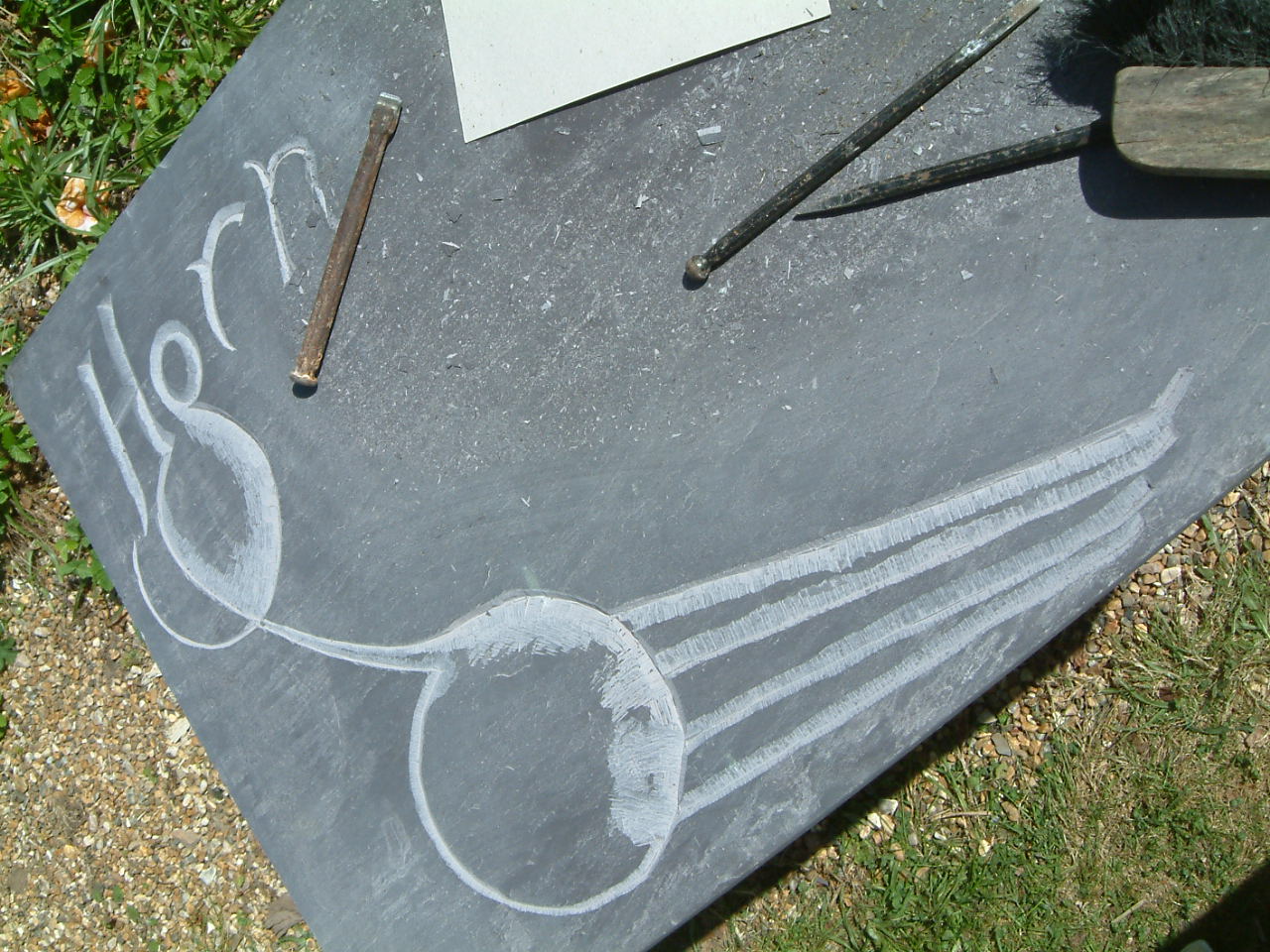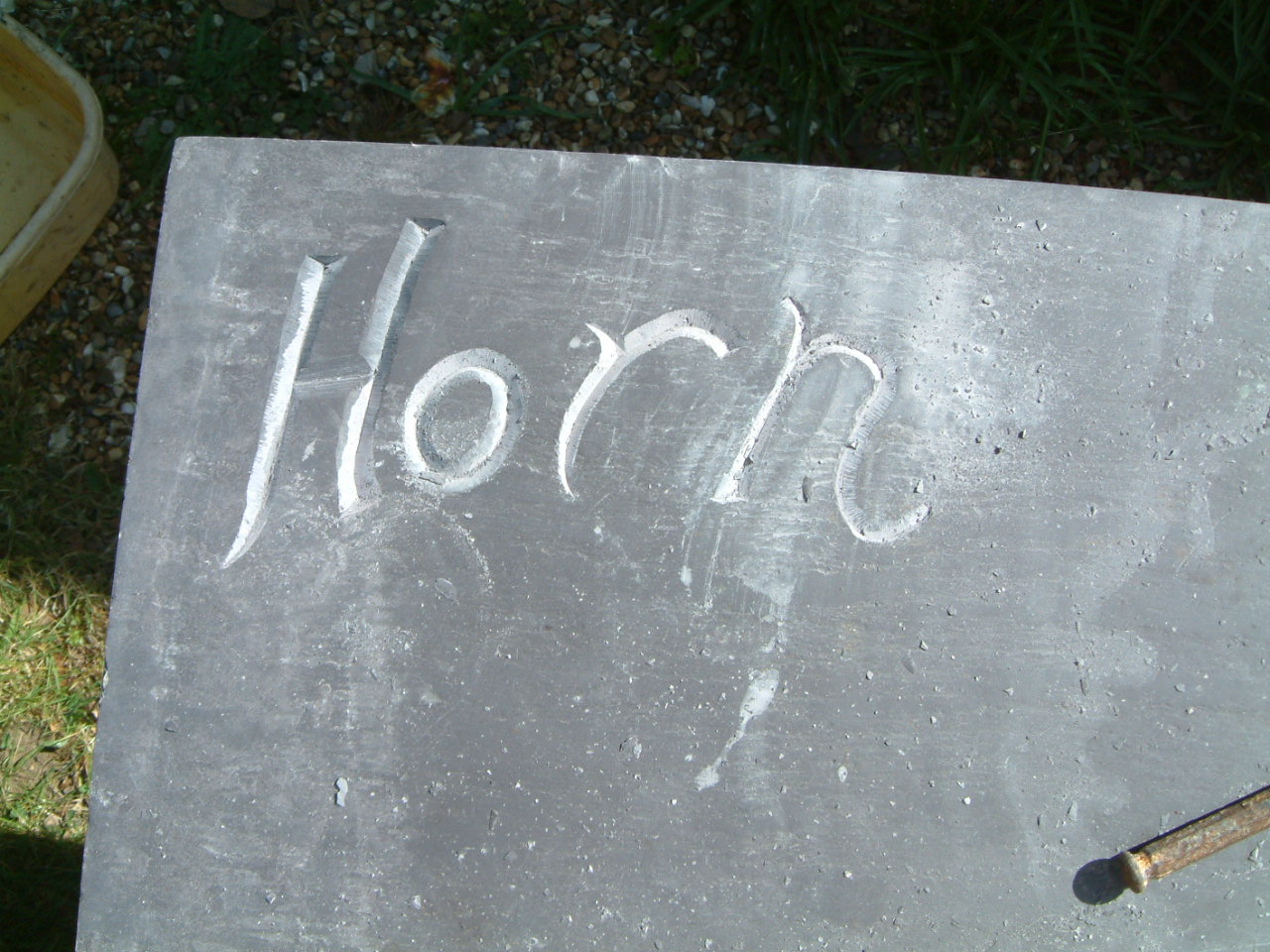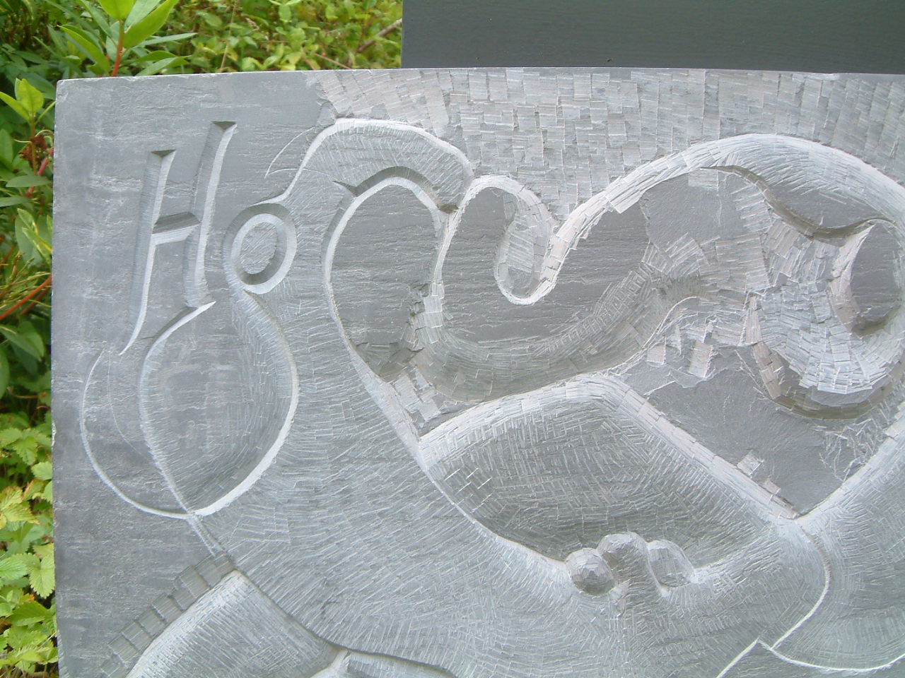 The images below present the (odd) prompts used for improvisation well, on a block donated by chance. I had no decision as to its size or proportion, just a blind acceptance. As an exploration of not pre-conceiving the direction of working, the slate slab was started as a lettered plaque, the first H being suggested randomly by my son and other consonants provided by others through a question posted on Facebook.