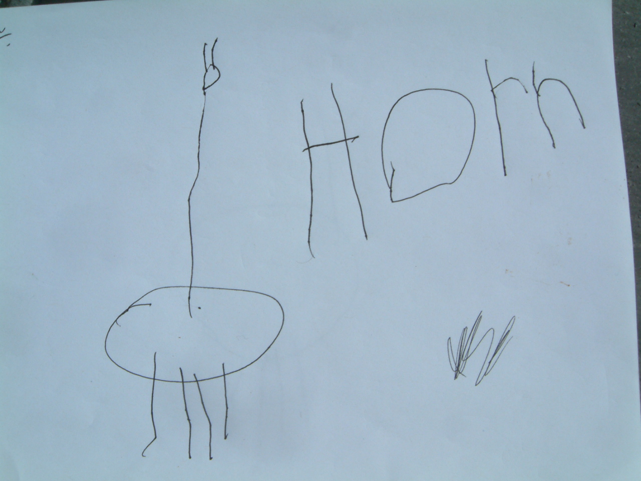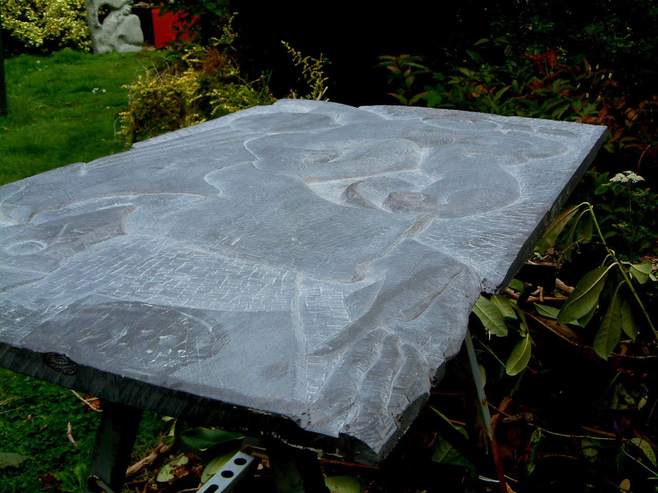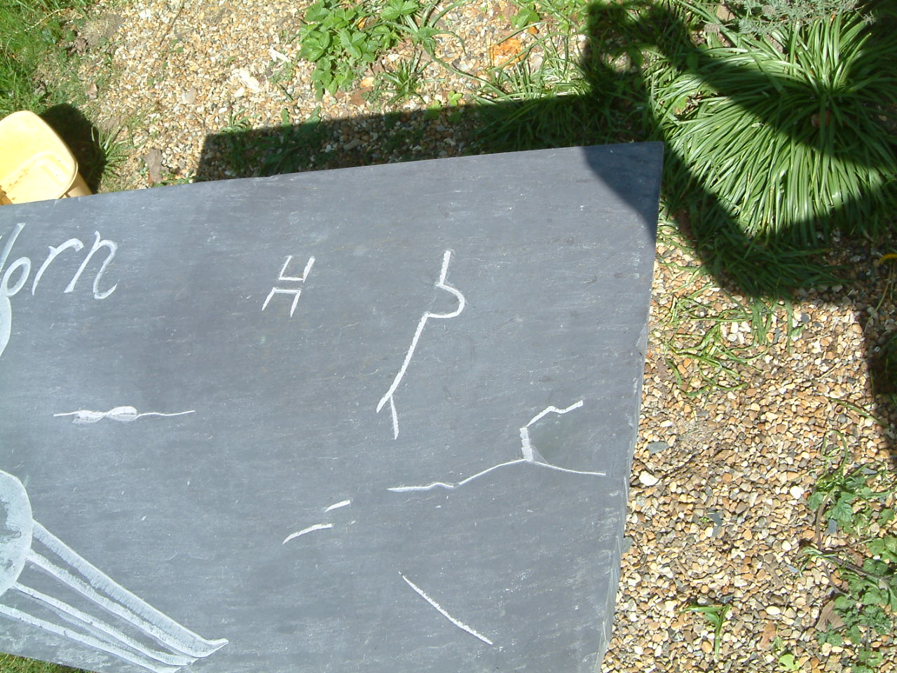 The first created word saw some association for a five year old, who linked it to a first drawing of a giraffe – presumably from the association with the fluffy nodules on the head of that animal. A second attempt had more rhythm and this triggered its being adapted to the surface of the slab without much thought from me. What followed was some exploration of the surface of the remainder of the slab, exploiting lines of weakness and marks various.
